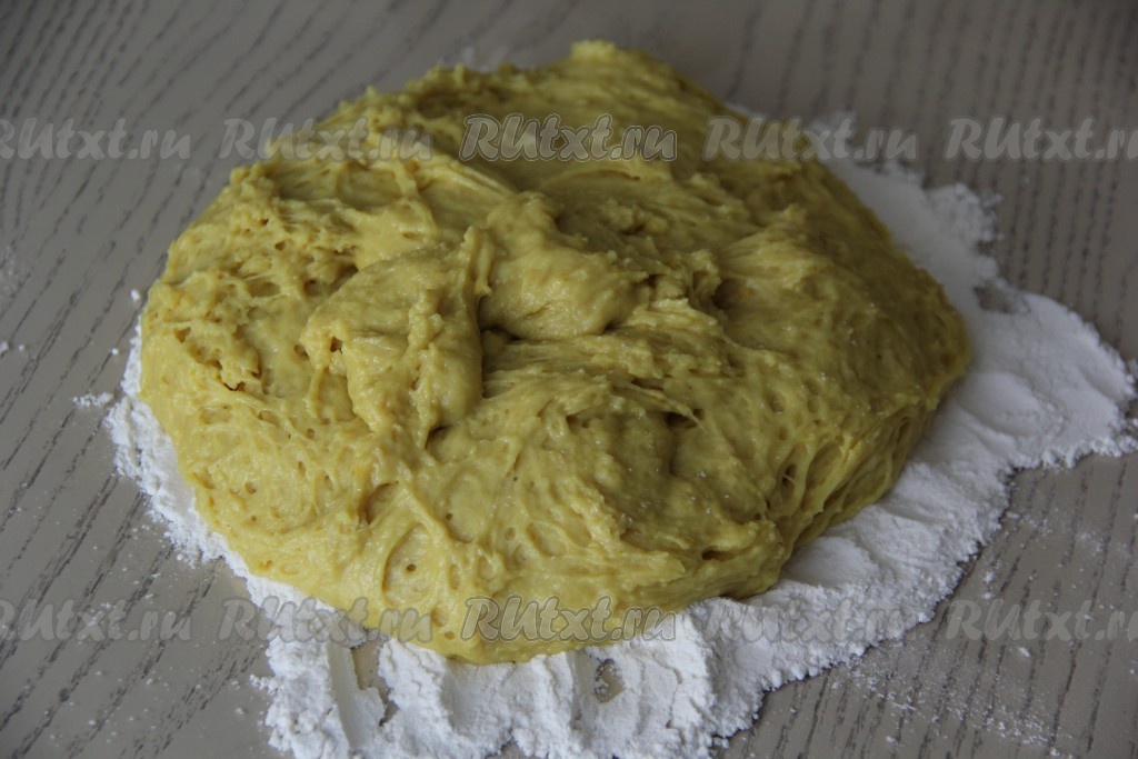 Хорошо присыпать стол (или силиконовый) коврик мукой и выложить тесто.