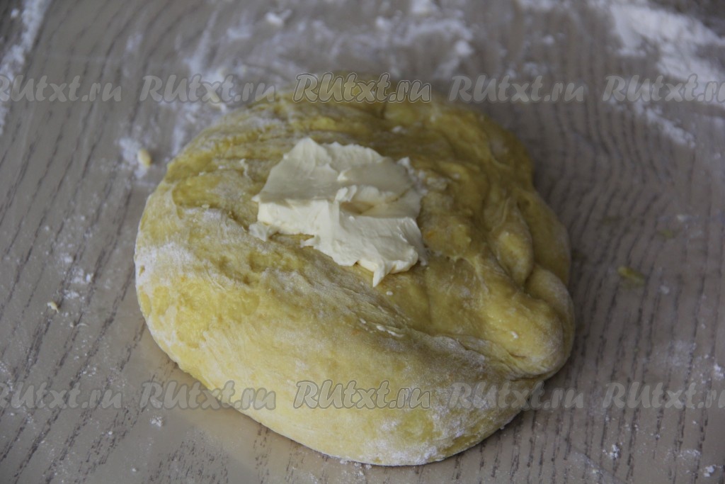 Слегка вмесить муку в тесто, а затем частями добавлять мягкое сливочное масло, каждый раз хорошо вмешивая его руками в тесто.