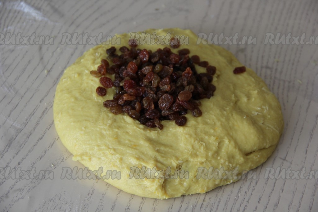 Предварительно подготовить изюм, залив его кипятком на 2-3 минуты, после этого откинуть его на дуршлаг и обсушить. Тесто вымешивать минут 7-10, оно станет пластичным и практически не липким. Добавить изюм и подмешать его в тесто.