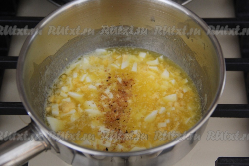 Затем добавить нарезанные яйца, соль по вкусу и щепотку специй, перемешать и снять польский соус с огня.