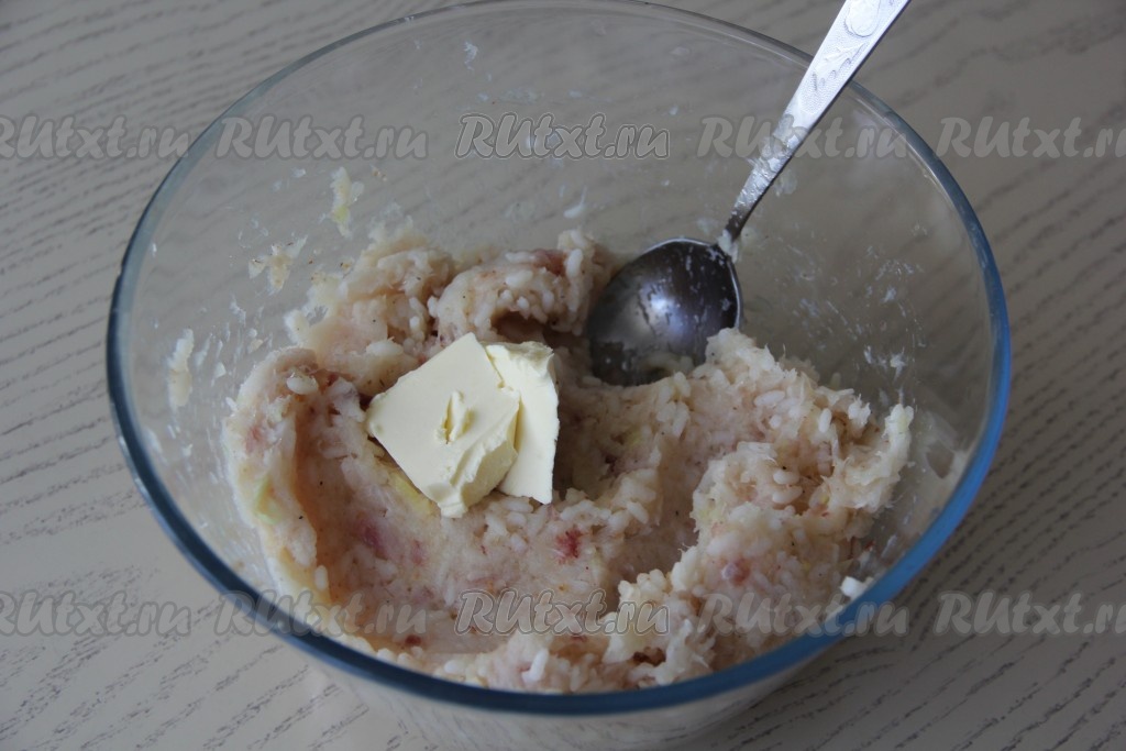 Тщательно перемешать рыбный фарш с рисом, добавить мягкое сливочное масло и хорошо перемешать.