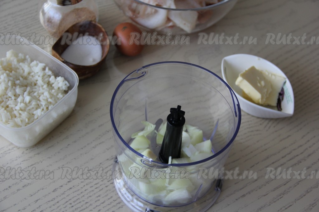 Лук почистить и измельчить в измельчителе комбайна (или пропустить через мясорубку).