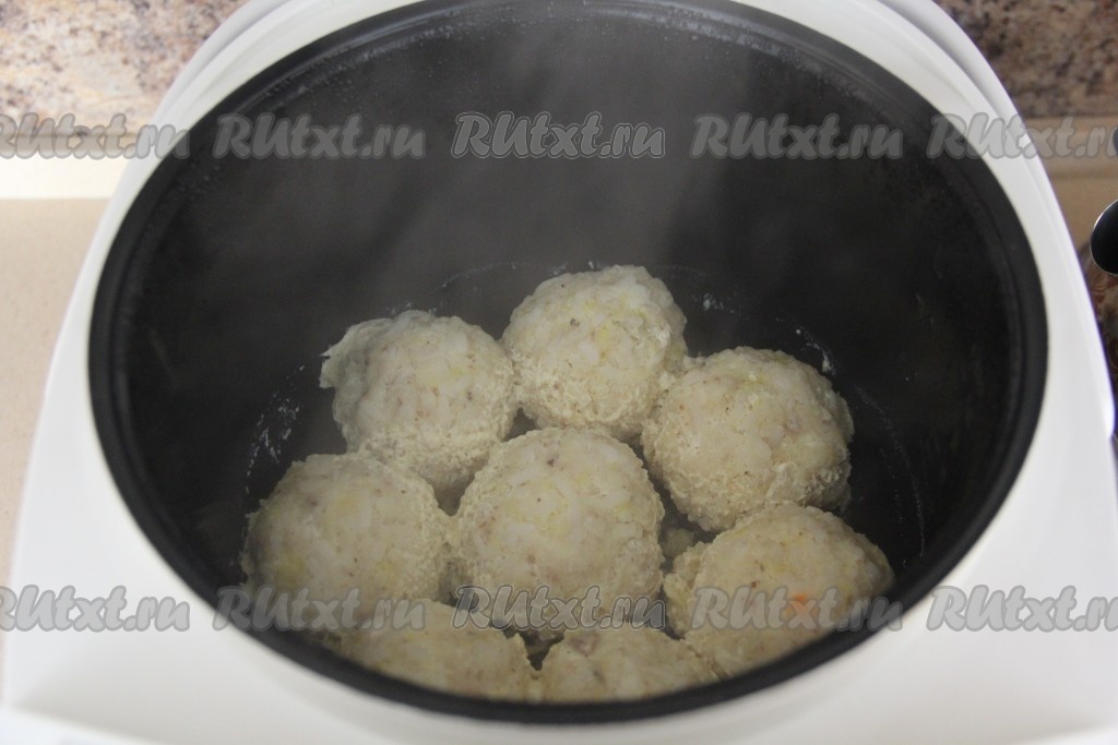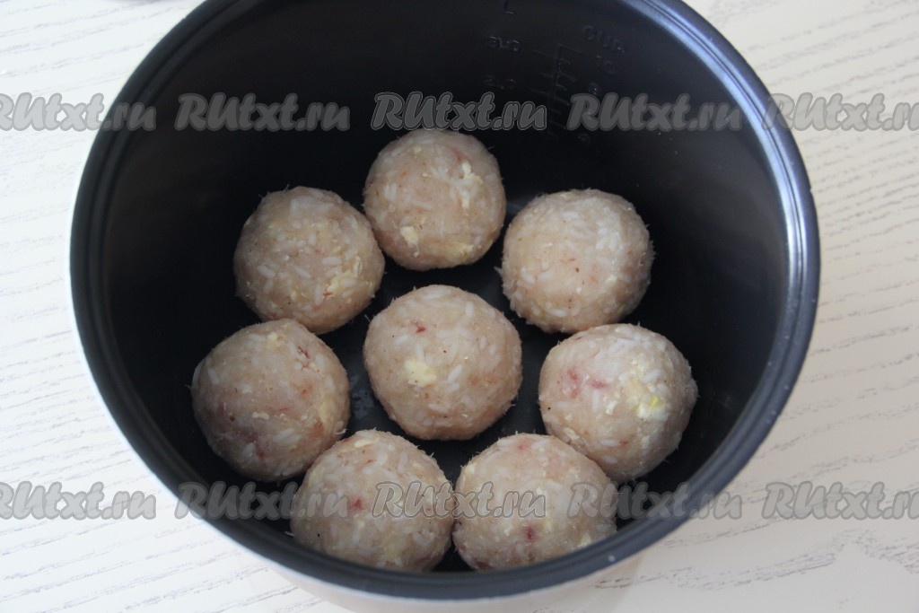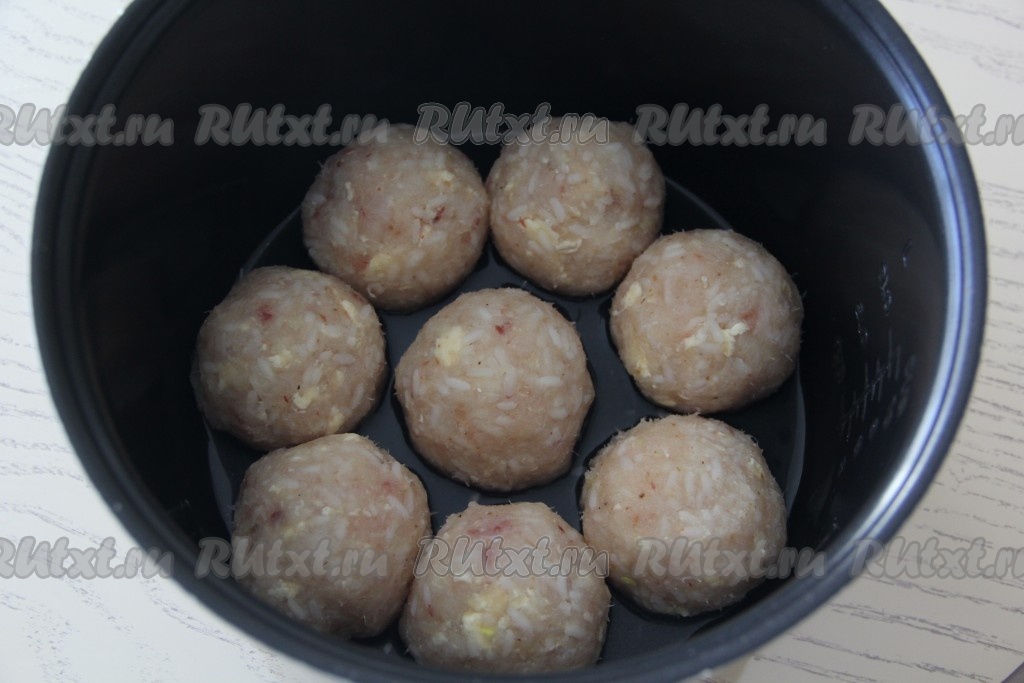Сформировать из массы тефтели весом, примерно, 115 грамм. У меня получилось 8 штук. Выложить рыбные тефтели в чашу мультиварки.