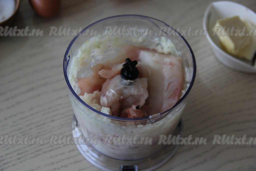 Затем добавить кусочки рыбного филе и измельчить до состояния фарша (или пропустить филе рыбы через мясорубку).