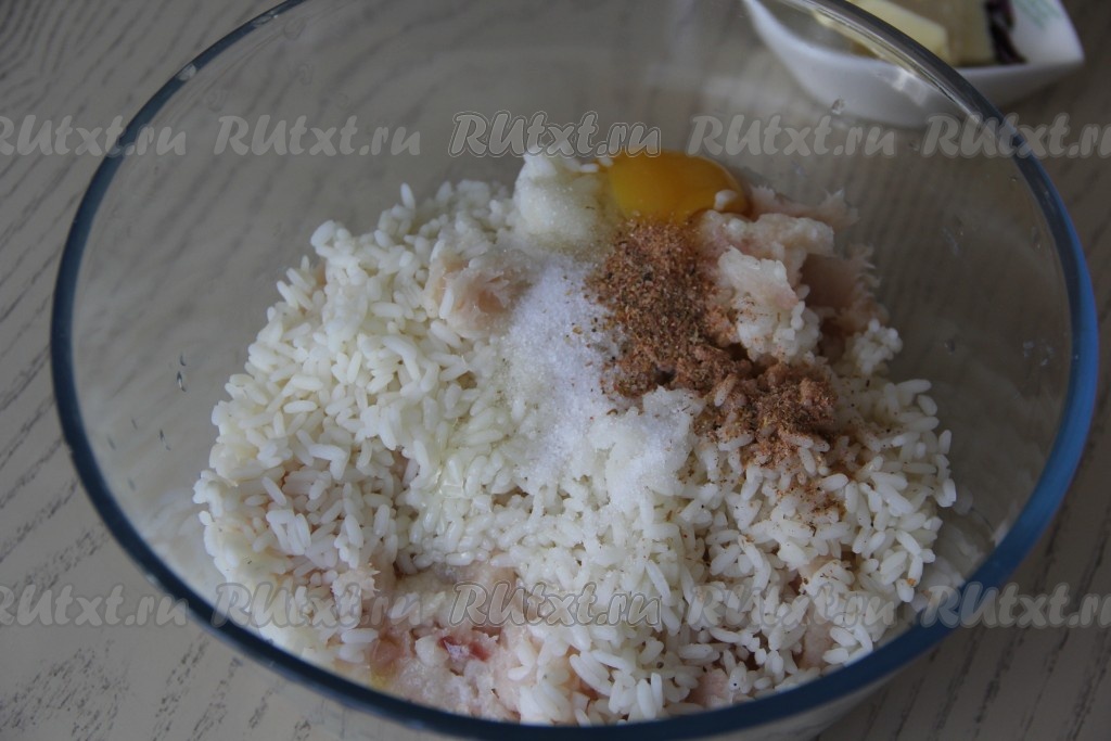 К рыбному фаршу с луком добавить 5 столовых ложек отваренного риса, сырое яйцо, соль и специи.