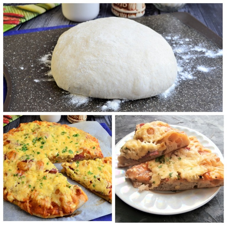 Подсыпав на стол немного муки, тесто сформировать в колобок и можно растягивать его в лепёшку и выкладывать начинку для пиццы. Печь пиццу в разогретой духовке при температуре 230-240 градусов около 15 минут. А можно, если не будете печь пиццу сразу, отправить тесто в холодильник на ферментацию часов на 7-10 (можно и дольше), потом достать его, дать немного нагреться при комнатной температуре и уже тогда готовить пиццу. У меня тесто после холодной ферментации стало более плотным.