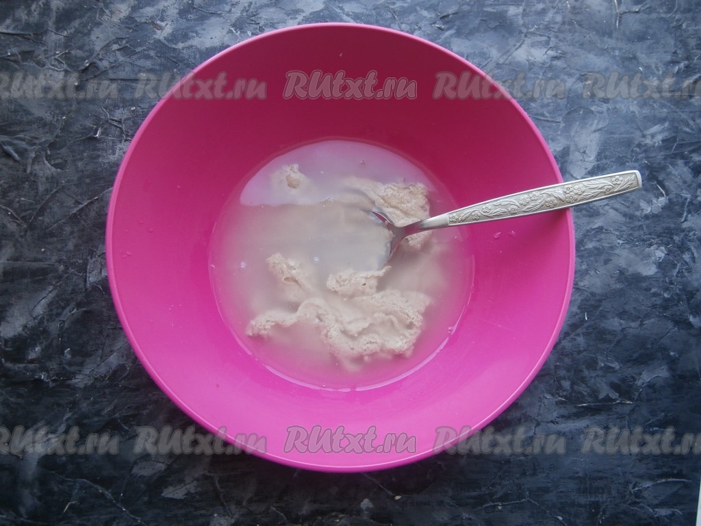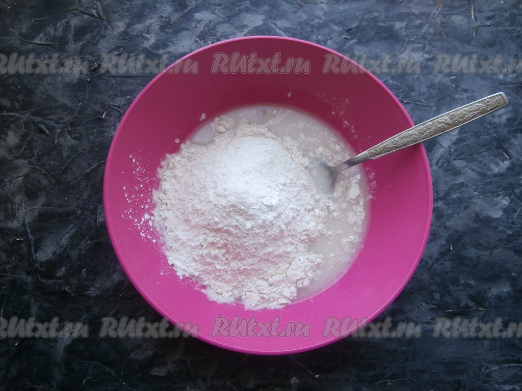 Замесить густое, липкое тесто ложкой, тщательно его перемешивая.