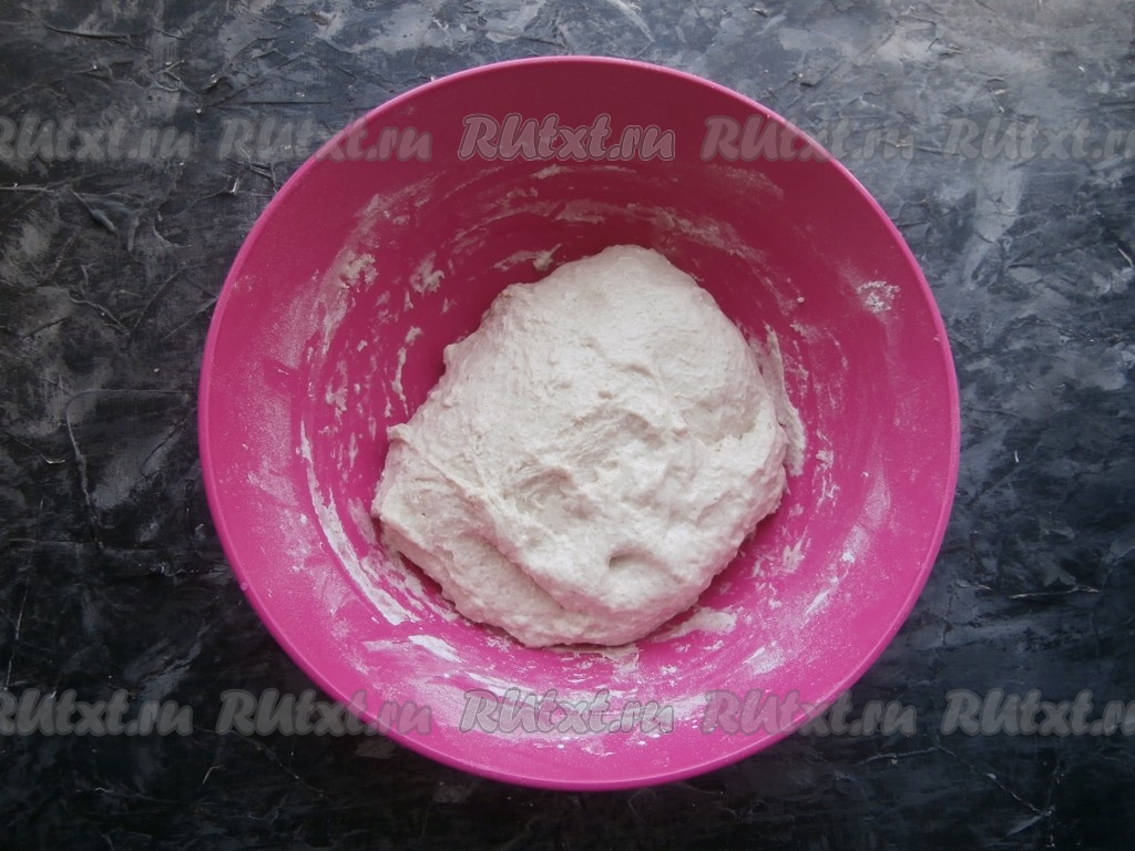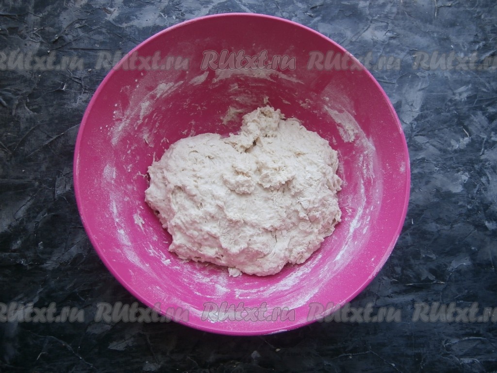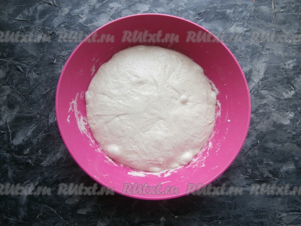 Закрыть посуду с тестом плёнкой и оставить его на 2-4 часа (зависит от окружающей температуры). Каждый час тесто нужно обминать (растягивать от краёв и складывать к середине), через каждый час можно увидеть, что тесто немного поднимается и на нём появляются пузырьки.