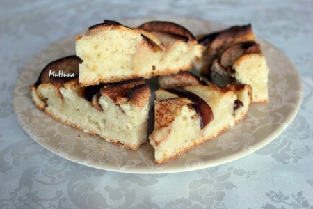 Готовый яблочный пирог достать из духовки, дать ему остыть минут 5, вынуть его из формы. Эту выпечку, замешанную на сметане и маргарине, можно подавать и тёплой, и полностью остывшей. А вот какой этот пирог с яблоками выглядит в разрезе. Угощайтесь!