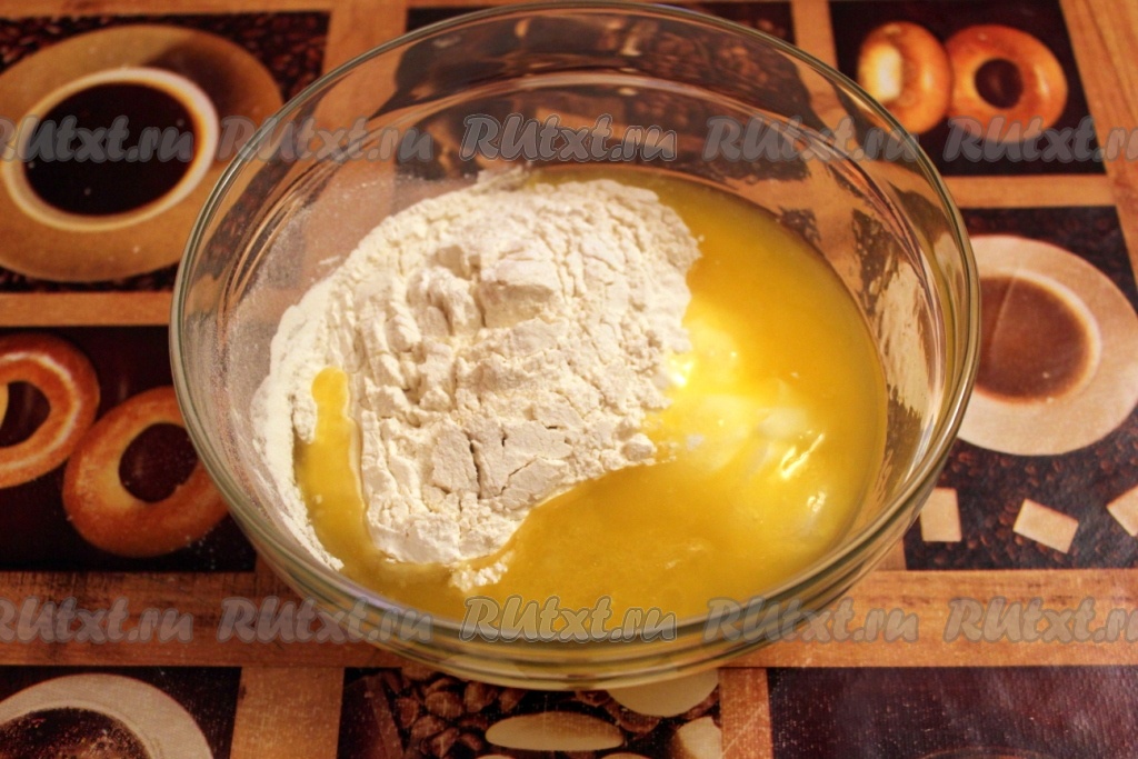 Маргарин растопить на плите (или в микроволновке), дать немного остыть. В объёмную миску влить растопленный остывший маргарин, добавить сахар, сметану, разрыхлитель и грамм 100 муки.