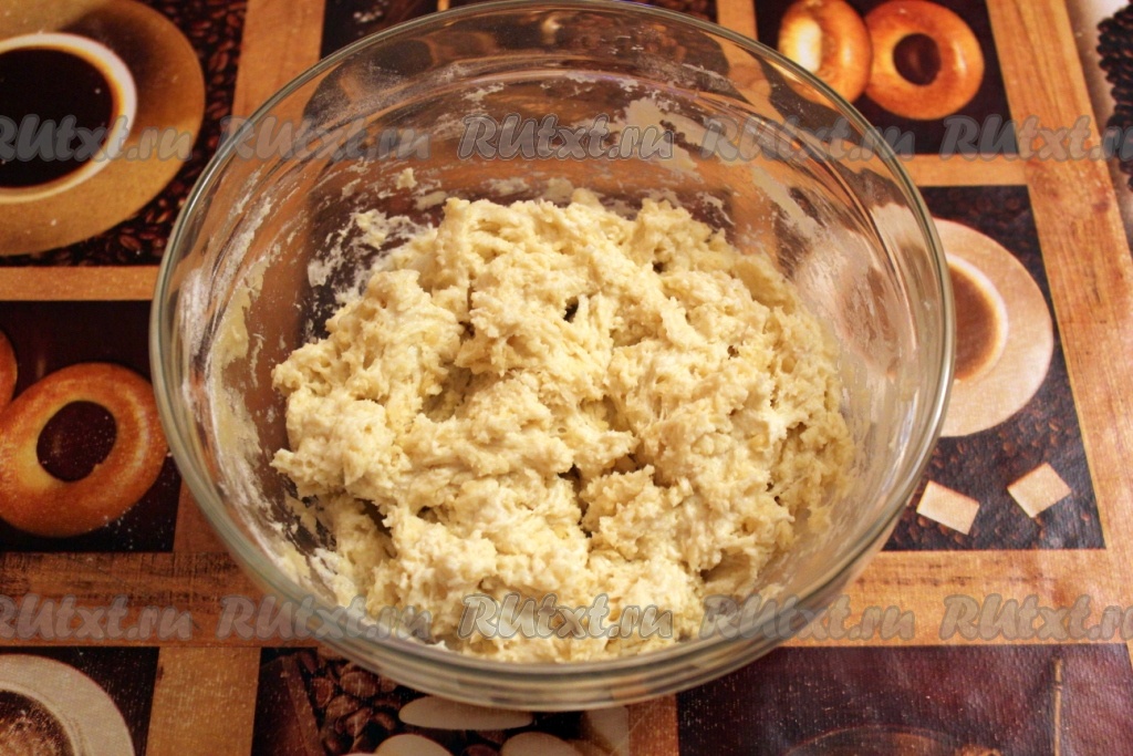 Перемешать тесто столовой ложкой или лопаткой. Постепенно подсыпая оставшуюся муку, замесить однородное, липкое тесто, как на фото.