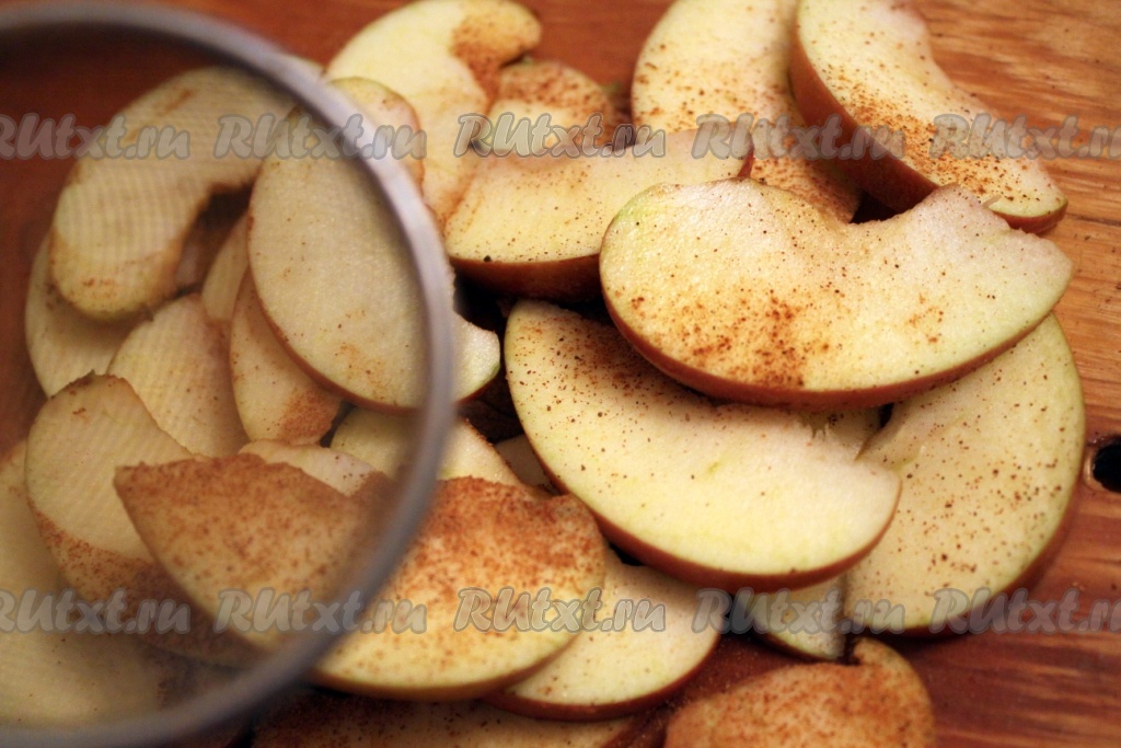 Яблоки нарезать на дольки, удаляя семенную коробку с косточками. Очищать яблоки от кожуры я не стала. Нарезанные яблоки через ситечко равномерно посыпать молотой корицей.