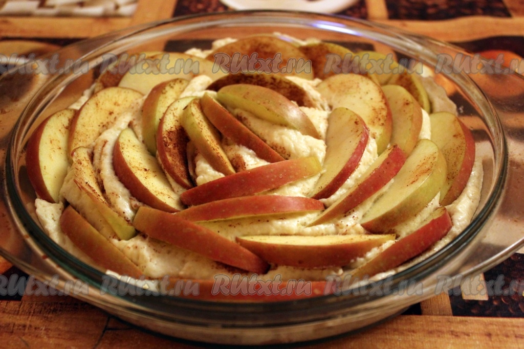 Форму для выпечки смазать растительным маслом. Выложить в подготовленную форму тесто. Сверху разместить нарезанные кусочки яблок, утопив их основательно в тесто.