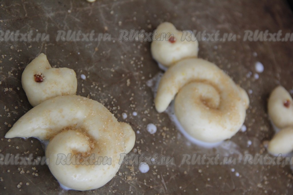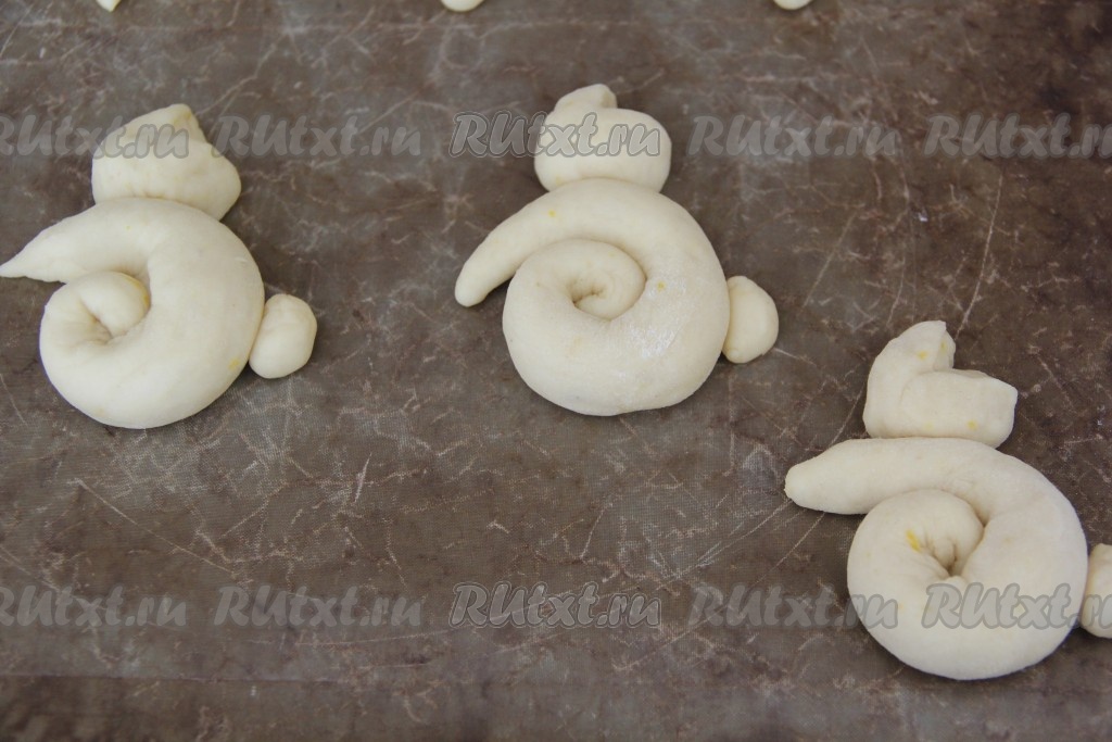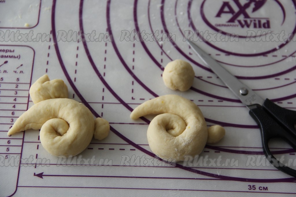 По прошествии 30 минут поднявшееся дрожжевое тесто ещё раз обмять и разделить на 7-8 частей (в результате получатся 7-8 пасхальных зайчиков). Приступаем к формированию первого "зайчонка", для этого нужно взять одну часть теста, разделить её на 3 части: большая часть - это будет тело зайчика, поменьше часть - это голова, самая маленькая часть - хвостик. Из большой части теста скрутить жгутик с тонкими кончиками, скрутить жгутик в улитку (как на фото). Сформировать колобок для головы, ножницами сделать разрез и у нас получатся ушки. Ну и хвостик сформировать в виде маленького колобка.