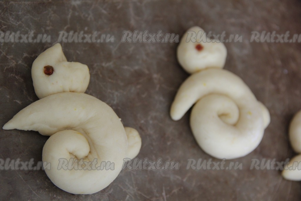 Оставить "зайчиков" на 30 минут в тёплом месте. Затем из изюма (или чернослива) вырезать маленькие кружочки - это будут глазки зайчиков и аккуратно вставить, слегка вдавив в тесто.