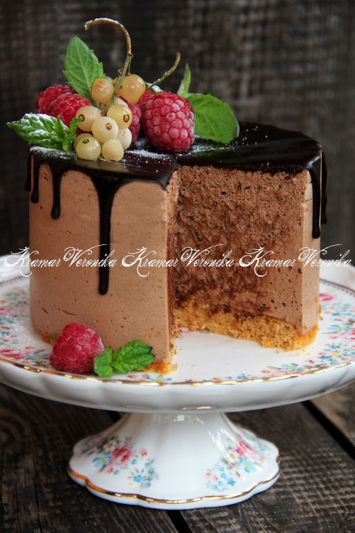 Снять бортики формы и переложить торт на тарелку. Шоколад растопить на водяной бане.