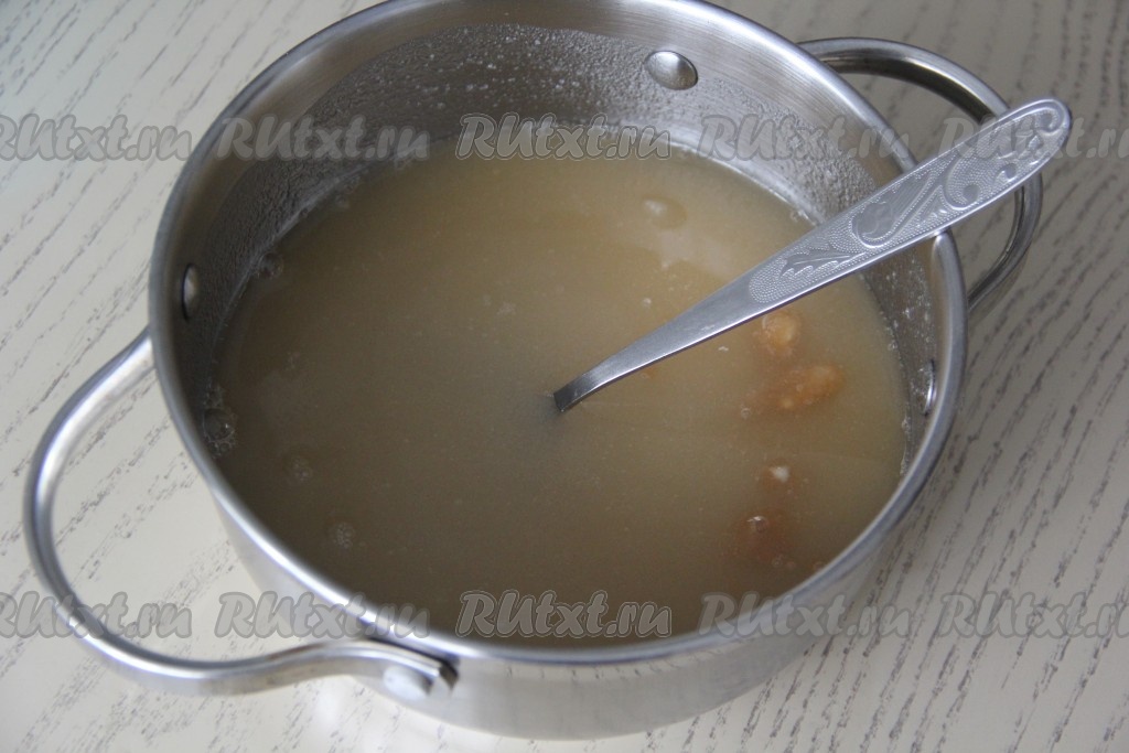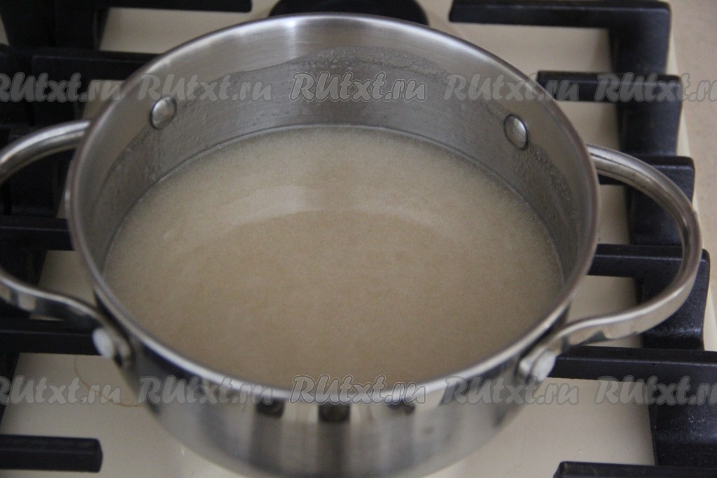 Довести сироп с агар-агаром, помешивая, до кипения, а затем проварить минуты 2-3. Снять сироп с огня и остудить до 110 градусов.