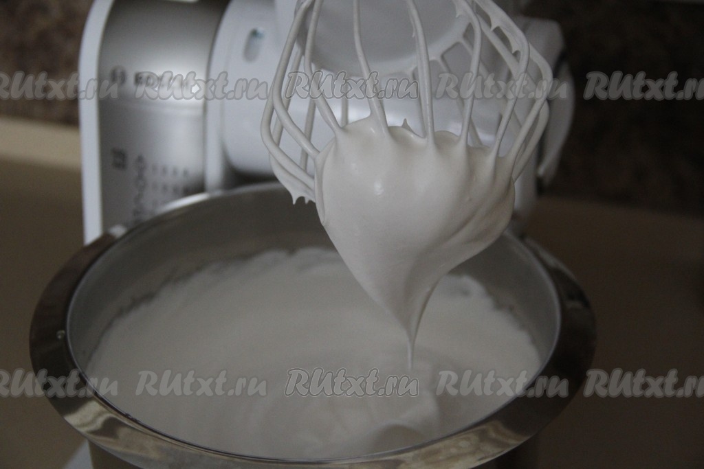 Взбивать белковую массу до стойких пиков.