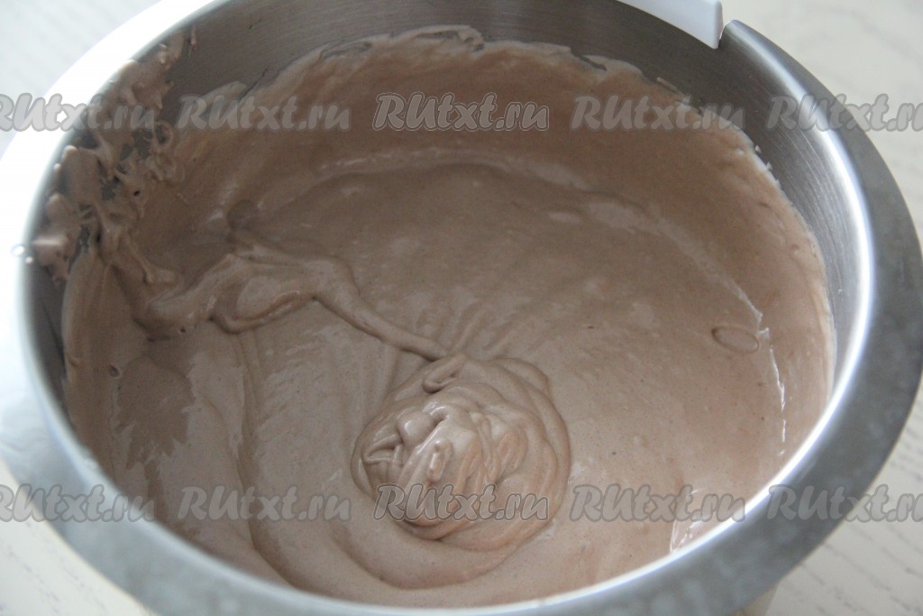 К взбитой белковой массе добавить шоколадно-масляную массу и взбить миксером до однородного состояния. Мусс получится блестящим, однородным.