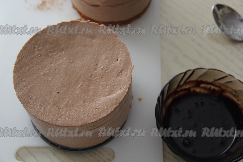 На дно формы, в которой будете формировать шоколадный торт "Птичье молоко" (я формировала в тех же форах, в которых выпекала бисквит), выложить бисквит, затем равномерно разложить мусс по формам.