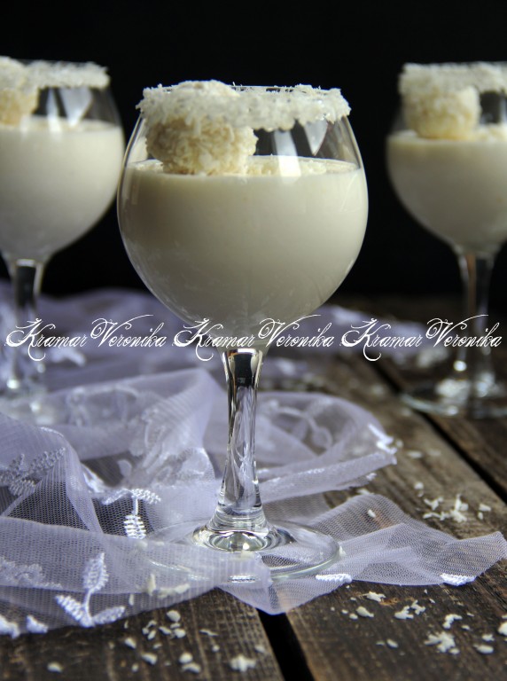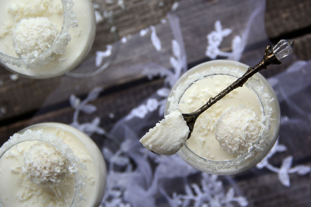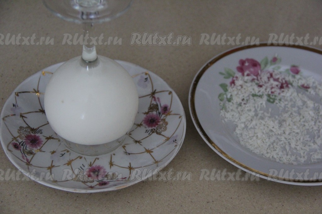 Всыпать кокосовую стружку в тарелку. Обмакнуть край фужера с застывшим десертом в сироп или в воду, а затем в кокосовую стружку.