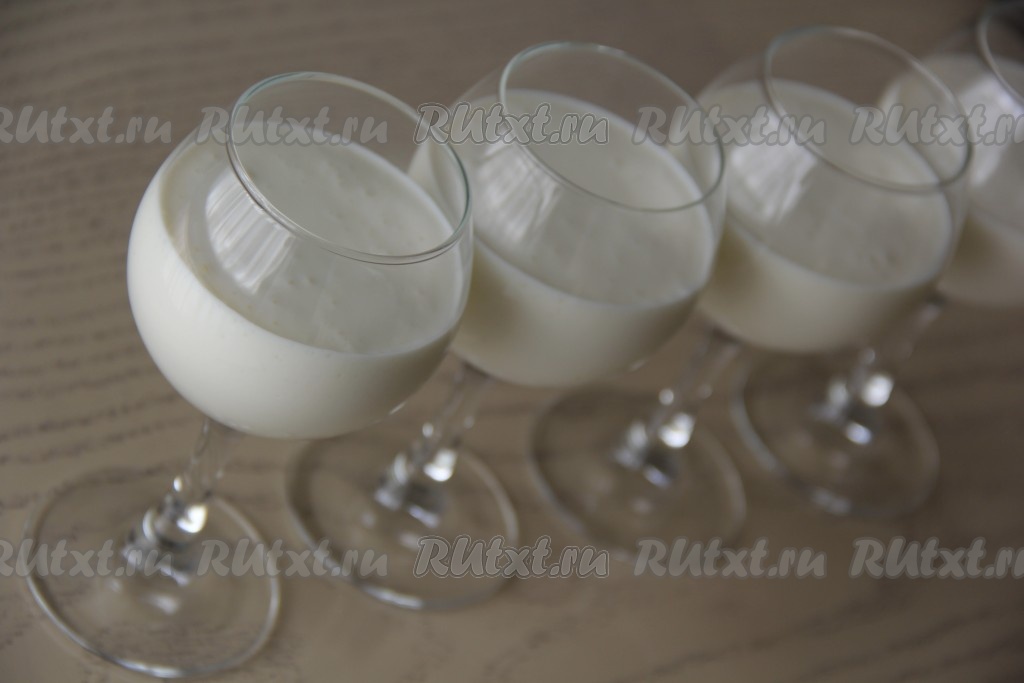 А затем влить желатиново-молочную смесь в чашу блендера с творожно-сметанной смесью и тщательно перемешать (или пробить погружным блендером). Разлить получившийся десерт по фужерам (я разливала по 4 фужерам).