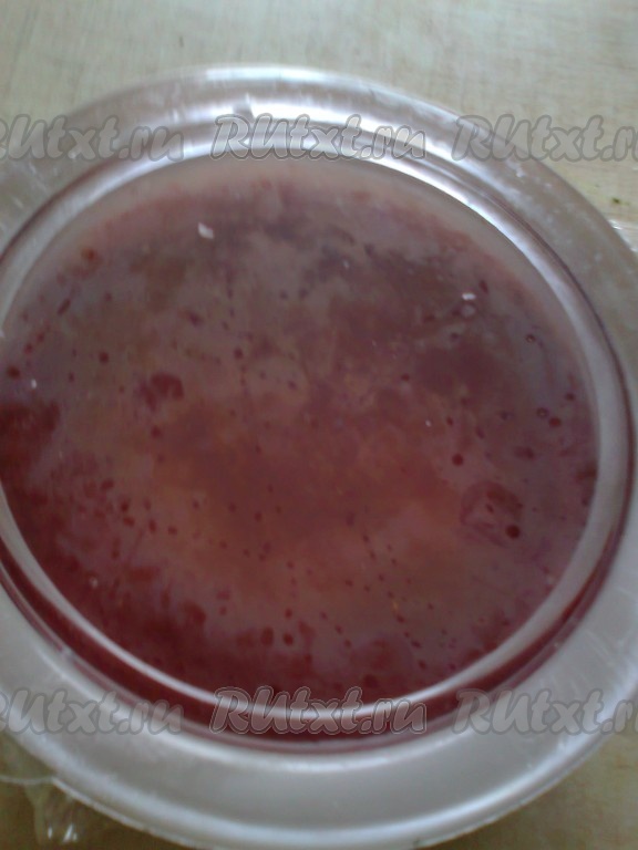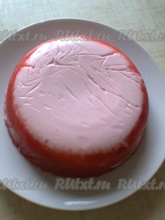 Клубнично-творожное желе готово. Вынуть миску из холодильника, перевернуть желе на блюдо и снять плёнку.