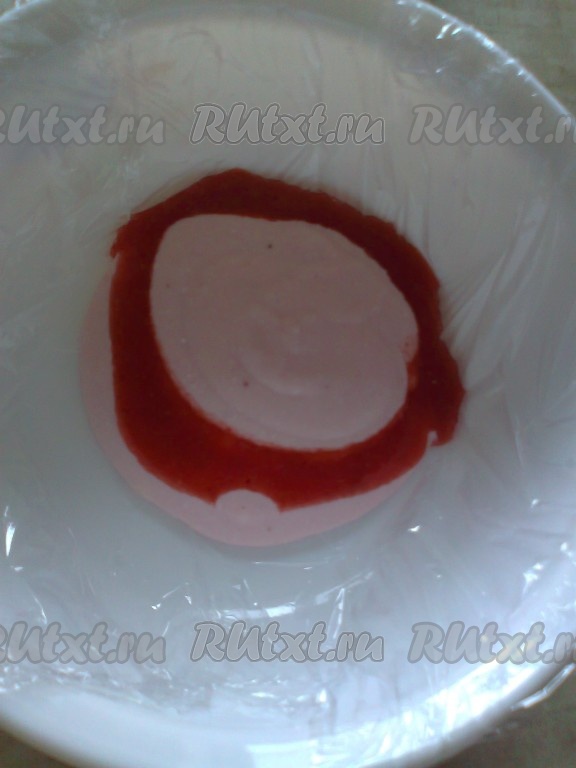 Выкладывать поочередно по 2 столовых ложки клубничной и творожной массы.
