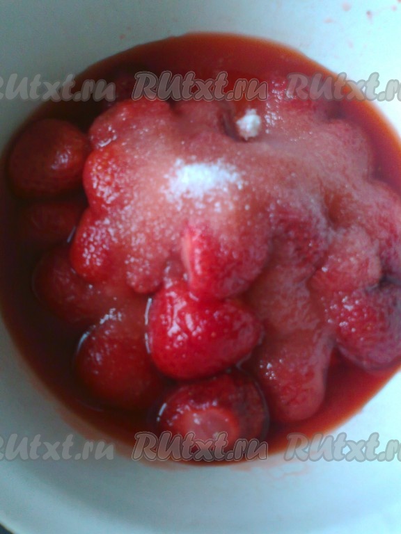 Клубнику можно использовать свежую или замороженную. Если используете замороженную клубнику, её надо сначала оставить на 1-2 часа для разморозки, затем слить 100 мл сока, а 350 грамм ягод поместить в миску, добавить сахар и взбить блендером до полного растворения сахара. Если используете свежую клубнику, тогда вымойте её, а затем просто взбейте ягоды с сахаром блендером и 100 мл пюре используйте в творожную массу.