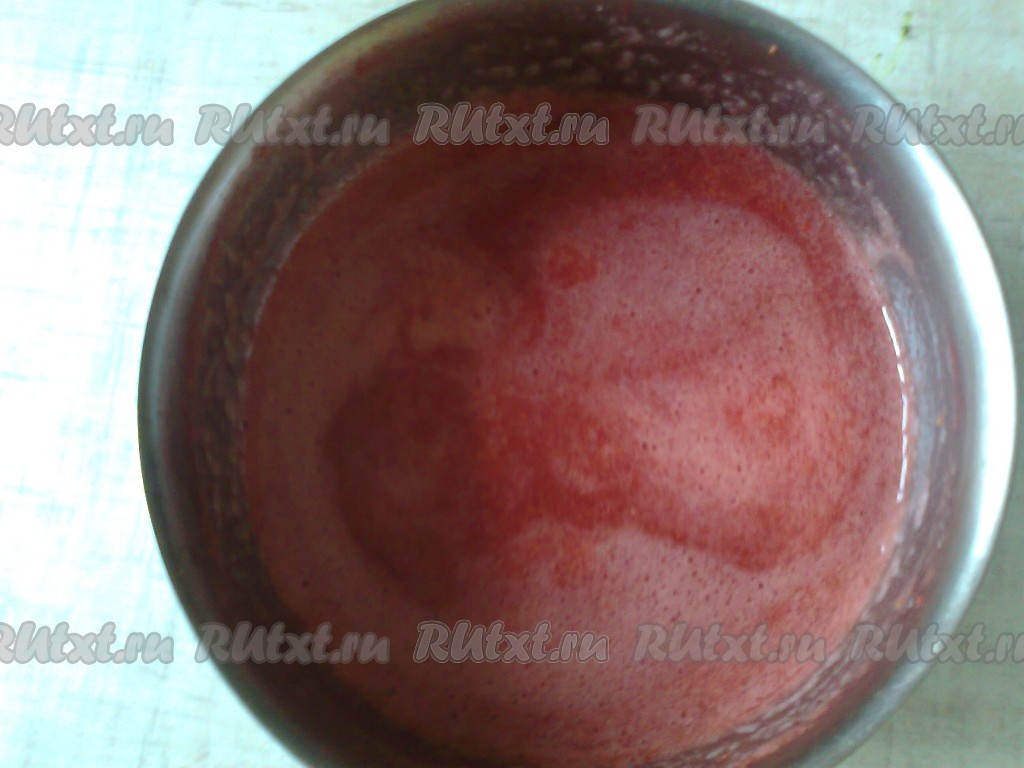 Набухший желатин надо разделить на 2 части - большую и меньшую (или можно отдельно замочить 10 грамм и 15 грамм желатина). Большую часть разбухшего желатина добавить в клубничное пюре с сахаром и, помешивая, довести его до полного растворения на среднем огне, не давая ему закипеть.