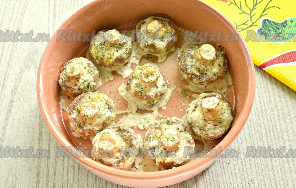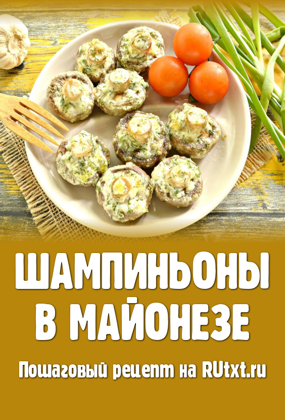 В разогретой до 180 градусов духовке запекать шампиньоны с майонезом и чесноком 30-35 минут. За время готовки шампиньоны уменьшатся в размере.