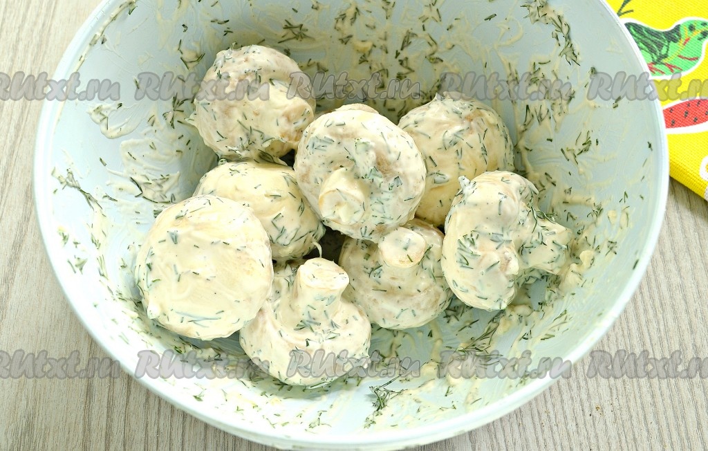 Шампиньоны выложить в широкую ёмкость, добавить подготовленный соус, аккуратно перемешать. Каждый гриб должен покрыться со всех сторон чесночно-майонезным соусом.