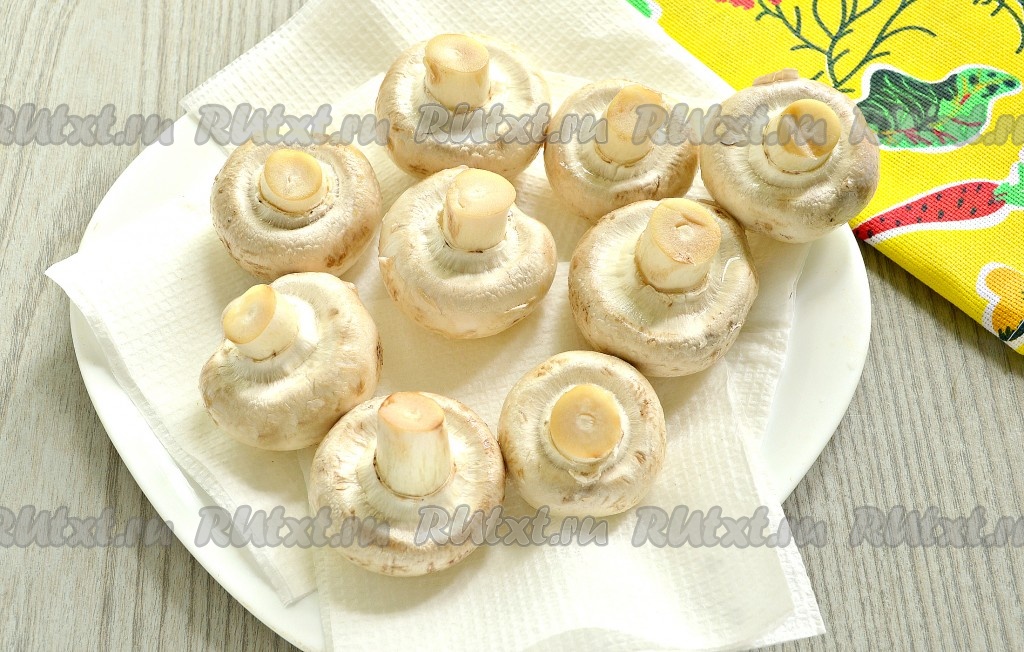 Свежие шампиньоны очистить от загрязнений, ополоснуть аккуратно под холодной водой. Затем выложить грибы на бумажные полотенца, чтобы убрать влагу. Отставить шампиньоны пока в сторону.