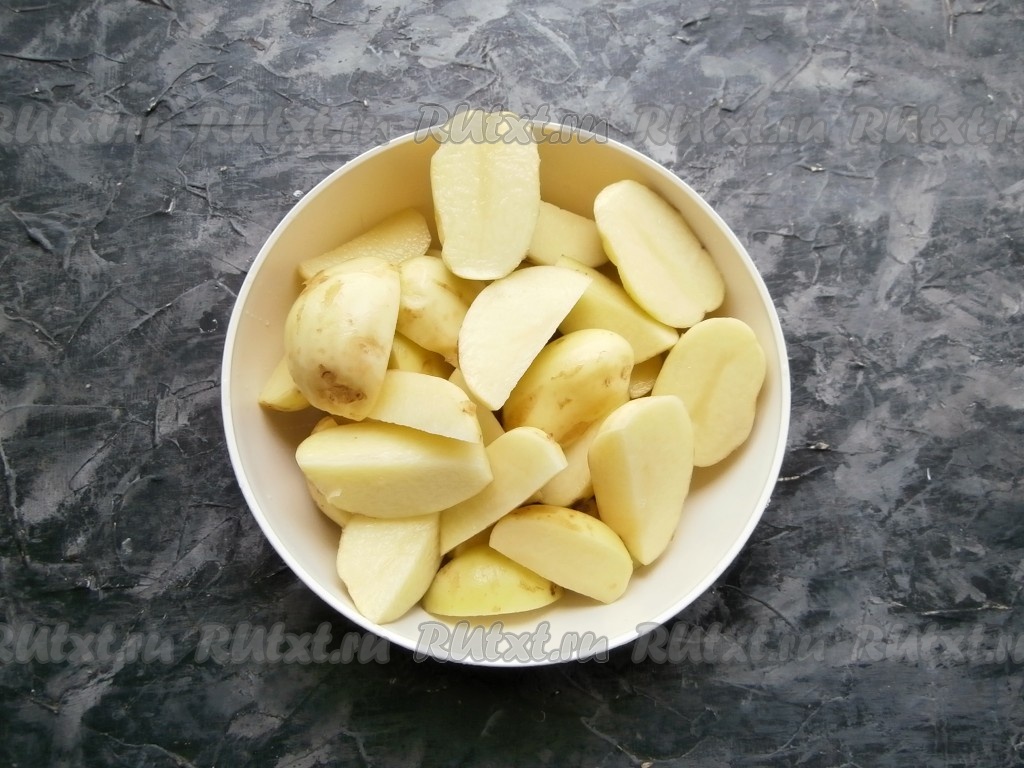 Молодой картофель поскоблить ножом, удаляя кожицу, затем помыть, крупные картошины разрезать на 2-4 части.
