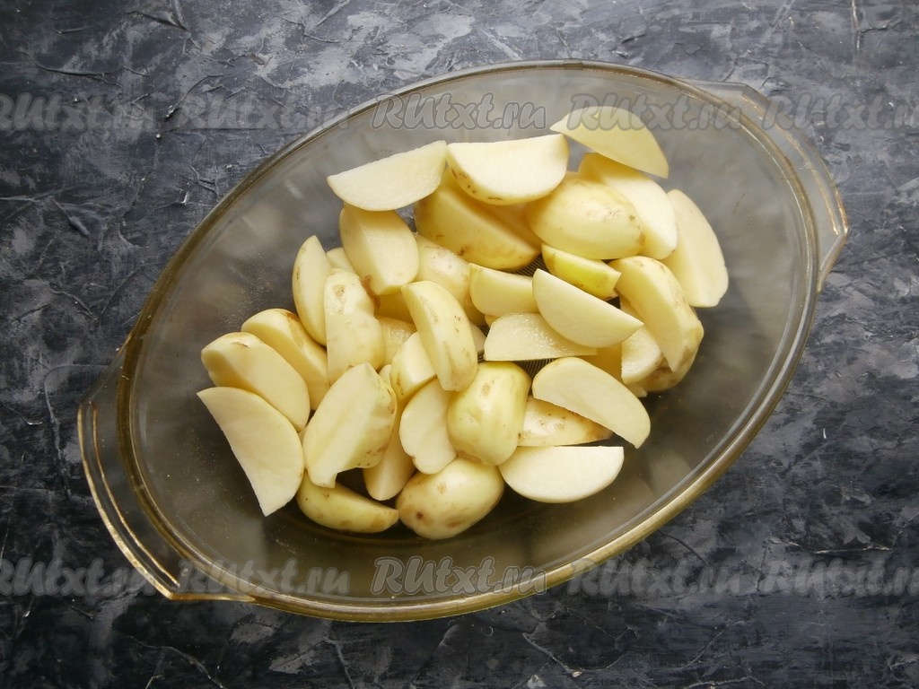 Картофель выложить в подходящую форму для запекания, полить растительным маслом.