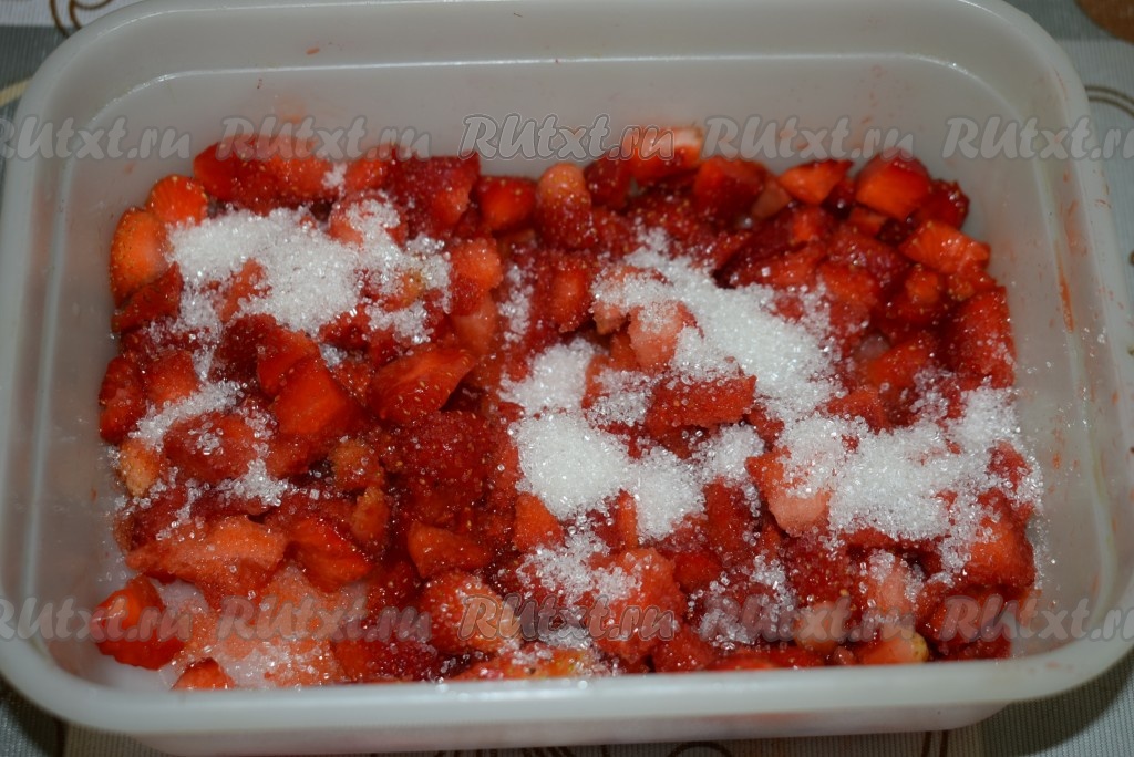 Далее выкладываем половину нарезанной клубники, смешанной с сахаром.