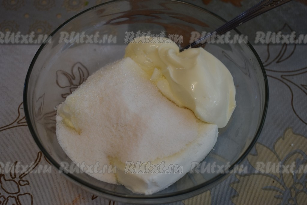 В отдельную миску перекладываем творог, добавим к нему сахар, ванильный сахар, сметану и творожный сыр. Сахар можете класть по своему вкусу (я добавила 3 столовые ложки).
