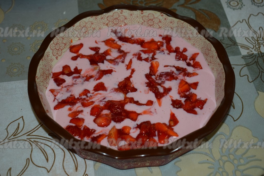 Сверху заливаем оставшуюся творожно-клубничную массу и выкладываем вторую половину клубники с сахаром.