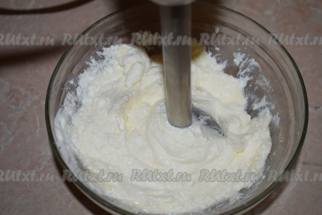 Далее погружным блендером взбиваем творог с сахаром, сметаной и творожным сыром до получения однородной кремообразной массы.
