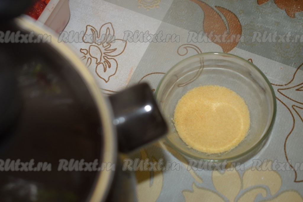 Быстрорастворимый желатин насыпаем в мисочку и заливаем очень горячей водой (не кипятком).