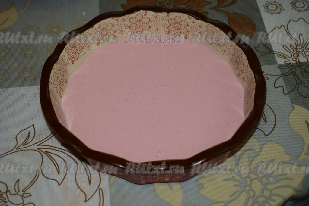 Берём форму (диаметр моей формы 22 см) и наливаем половину творожно-клубничной массы.