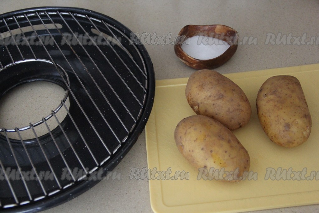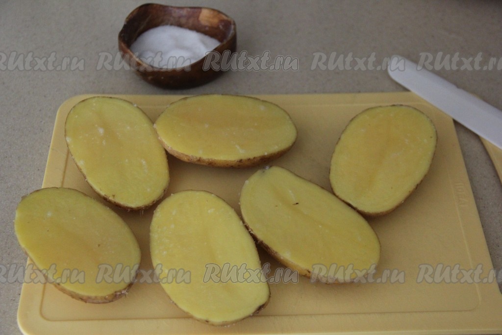 Картошку разрезать на две части и посолить со всех сторон.