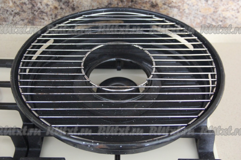 Сковороду поставить на газ так, чтобы круг в сковороде был чётко по краю газа. 200 мл воды влить в сковороду. Установить поверх сковороды решётку.