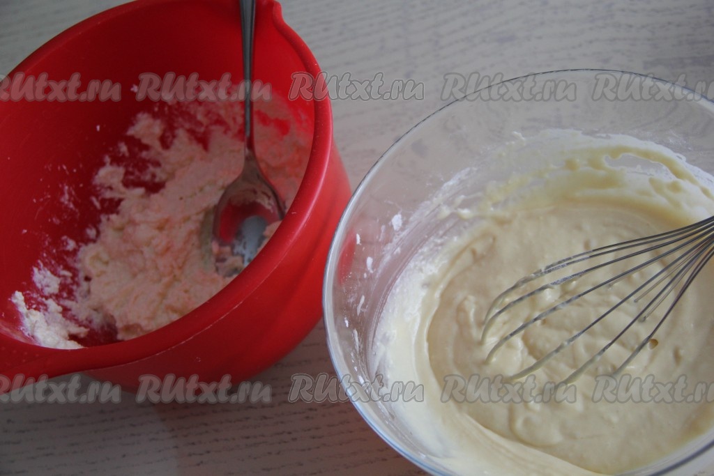 Перемешать тесто венчиком до однородного состояния. Тесто для ленивой ватрушки получится достаточно жидким (как на фото), оно будет напоминать тесто для оладий. Для приготовления начинки соединить творог, яйцо и сахар, перетереть творожную массу ложкой (или вилкой) до однородности.