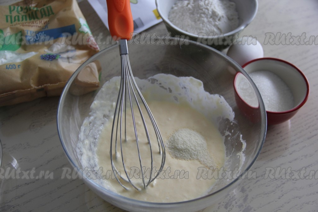 Затем всыпать манку и снова перемешать.