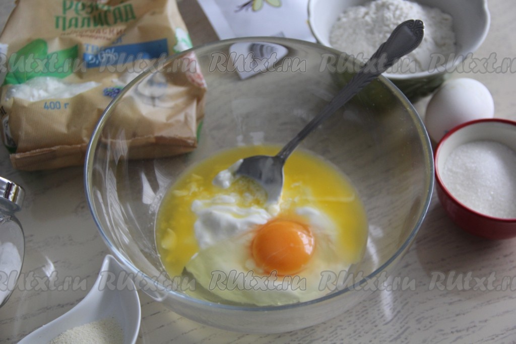 Вначале замесим тесто для ватрушки, для этого в миске нужно соединить сметану, яйцо и растопленное не горячее сливочное масло (или маргарин), перемешать венчиком.