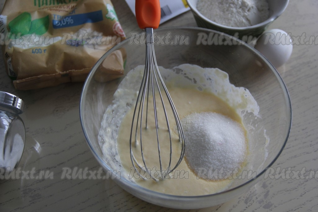 Добавить в получившуюся сметанную смесь сахар, ещё раз перемешать.