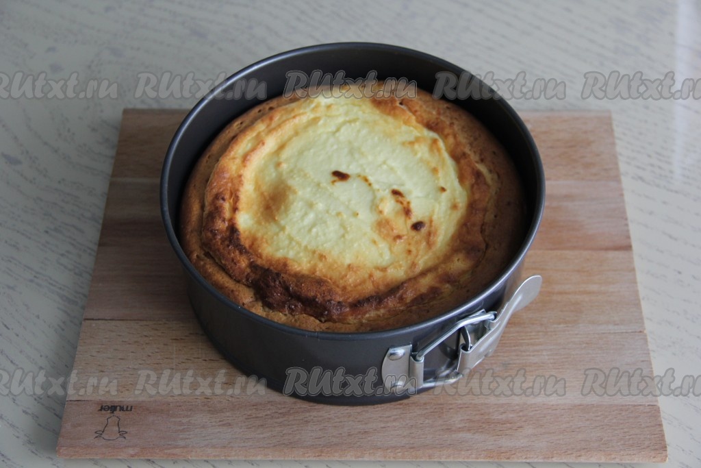 Поставить форму с ленивой ватрушкой с творогом в холодную духовку! Выставить температуру 190 градусов и выпекать 50 минут.