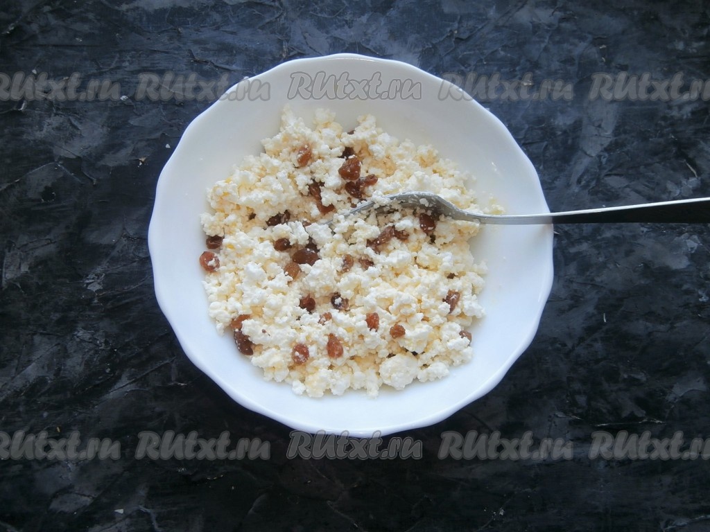Хорошо перемешать получившуюся творожную массу вилкой, по желанию, добавить горсть, предварительно промытого и обсушенного, изюма.