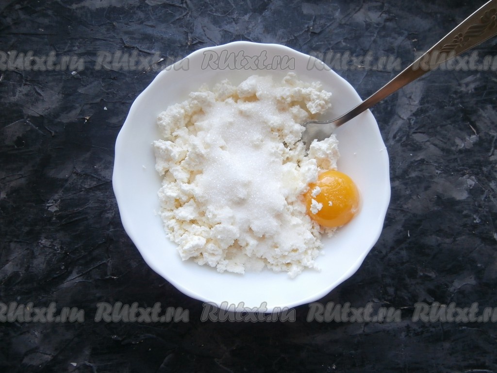 В глубокой тарелке (или миске) в творог добавить сырой желток, всыпать сахар и ванильный сахар.